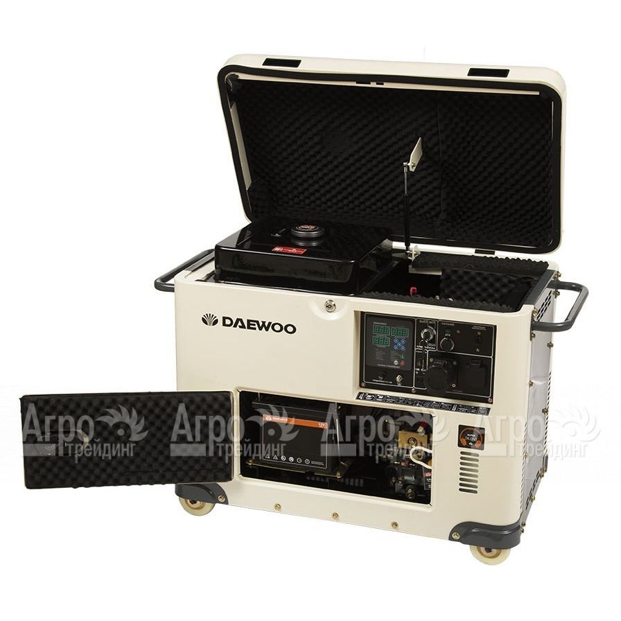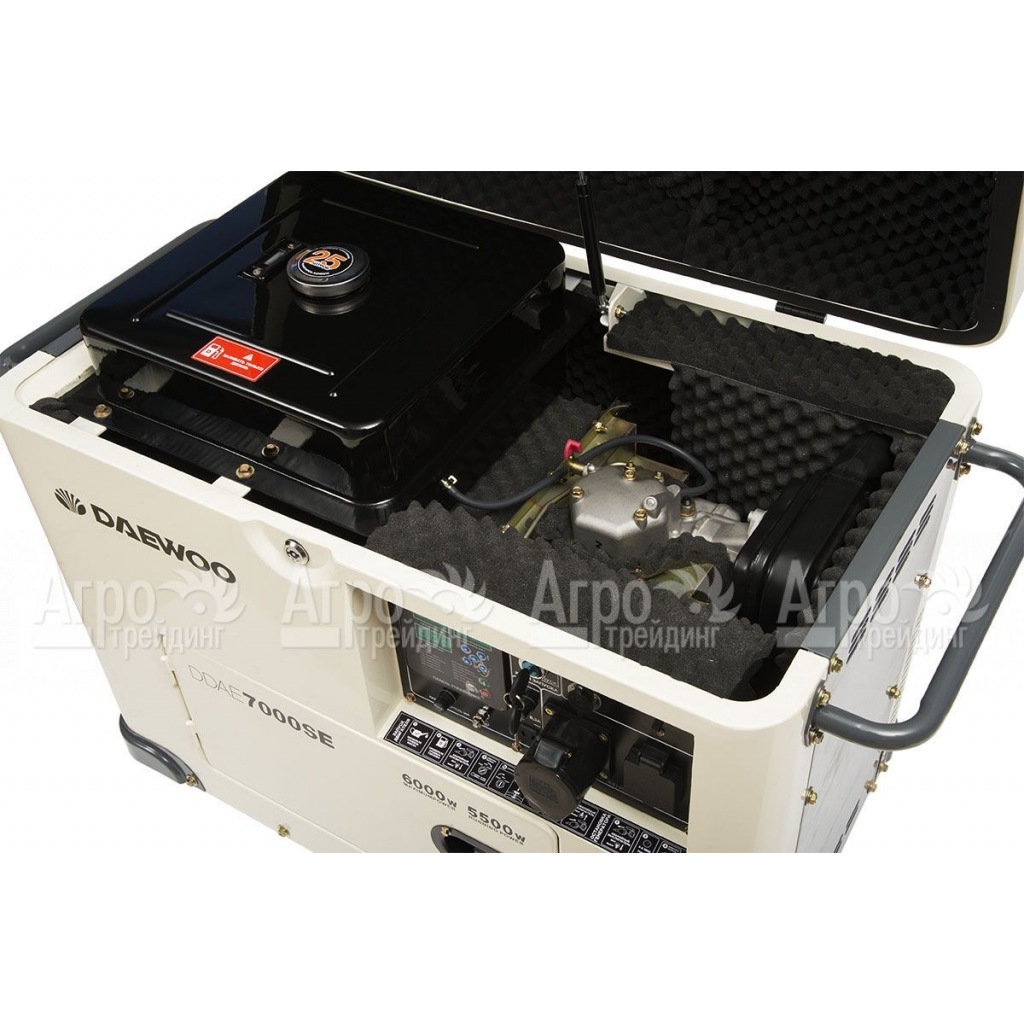 Характеристики товара: Дизельгенератор Daewoo DDAE 7000 SE 5.5 кВтПодробное описание товараДизельгенератор Daewoo DDAE 7000 SE предназначен для питания однофазных потребителей общей мощностью не выше 6 кВт. Выполнен в шумоизолирующем кожухе Super Silent, который обеспечивает гашение шумов и вибрации, а также защиту внутренних узлов от внешних воздействий. Топливо закачивается в двигатель в автоматическом режиме с помощью топливного насоса высокого давления и специальной форсунки, что делает работу двигателя стабильной и на 15% экономит топливо. Профессиональный двигатель обладает ресурсом более 2000 часов, стартер и аккумулятор позволяют осуществлять запуск от ключа. Встроенное устройство автоматического контроля напряжения обеспечивает качество тока на выходе. Опционально доступна установка блока автоматики ATS для автоматического запуска. Система защиты от перегрузок и датчик контроля уровня масла повышают надежность и эксплуатационную службу дизельгенератора. Альтернатор с медными обмотками обеспечивает стабильную выработку тока, мощность и отличную теплоотдачу. На компьютере с многофункциональной сенсорной панелью управления, в режиме реального времени можно наблюдать все основные параметры работы дизельгенератора Daewoo DDAE 7000 SE -напряжение, силу тока, частоту тока, нагрузку, запас топлива, температуру двигателя, запас топлива, количество отработанных моточасов. Штатное зарядное устройство размещенное на панели управления дает возможность заряжать автомобильный аккумулятор.