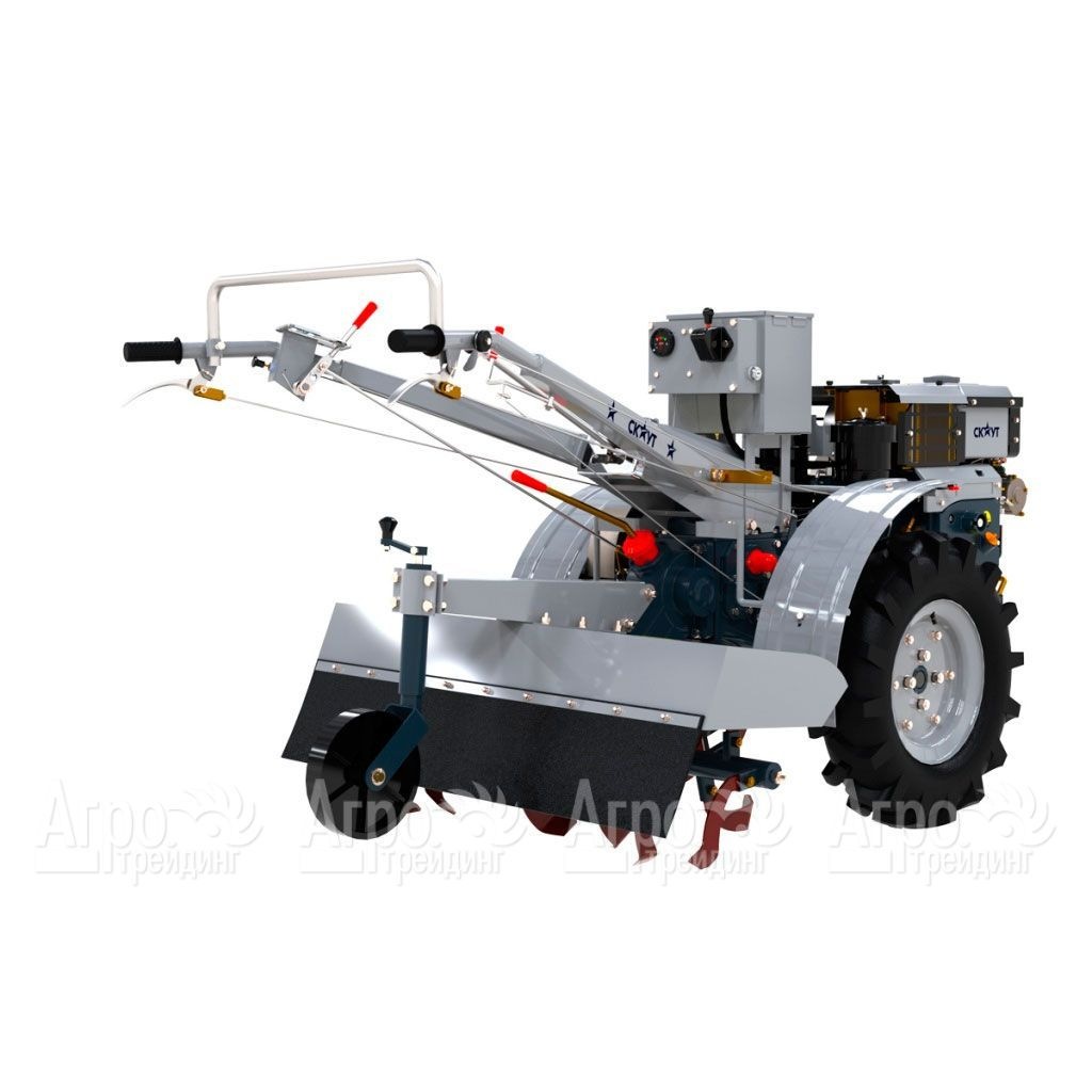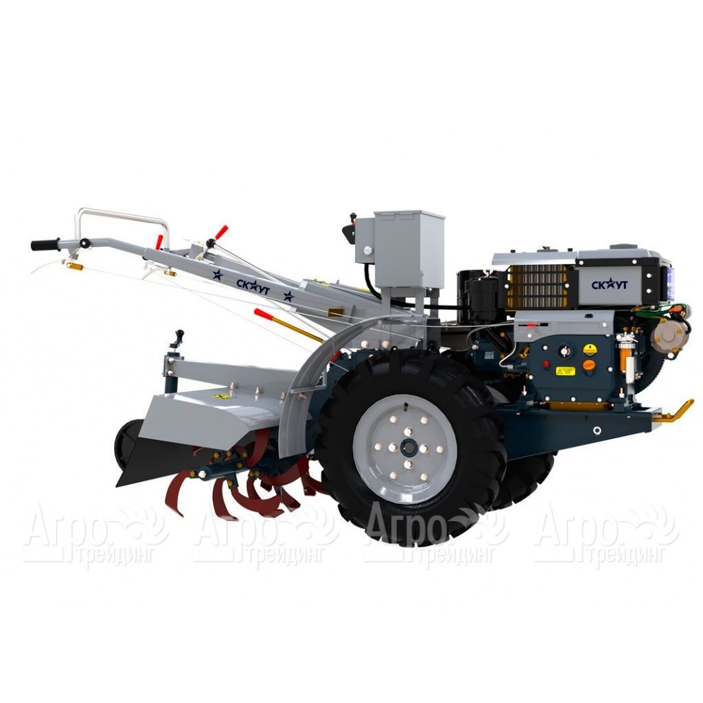 Характеристики товара: Мотоблок Garden Scout (Скаут) GS 81 DE, почвофрезаПодробное описание товараУниверсальный мотоблок Garden Scout (Скаут) GS 81 DE - многофункциональная техника, разработанная в помощь владельцам больших земельных участков, фермерам, которая способна агрегироваться с большим ассортиментом навесных орудий, что дает возможность выполнять всевозможные работы на полях, перевозить грузы, очищать территорию от снега. Мотоблок эффективен для работы на больших площадях, работает от дизельного четырехтактного двигателя, отличается надежностью, маневренностью, имеет три ВОМ -шлицевой, ременной, шестеренчатый. В конструкции предусмотрена фара, что позволяет осуществлять работы при в темное время суток. В заводскую комплектацию входит почвофреза. Двигатель надежен и стабилен в работе, адаптирован для работы в зимнее время, может запускаться как ручным, так и электрическим стартером, и имеет систему водяного охлаждения, которая защищает его от перегрева. Большой выбор скоростей обеспечивает работу с разным навесным оборудованием. Возможность разблокировки дифференциала для каждого колеса обеспечивает маневренность тяжелого мотоблока Garden Scout (Скаут) GS 81 DE, оператор может непосредственно на месте разворачивать тяжелый мотоблок. Крупные колеса с протектором обеспечивают высокое тяговое усилие. Наличие в конструкции мотоблока фары позволяет выполнять работы в вечернее время.