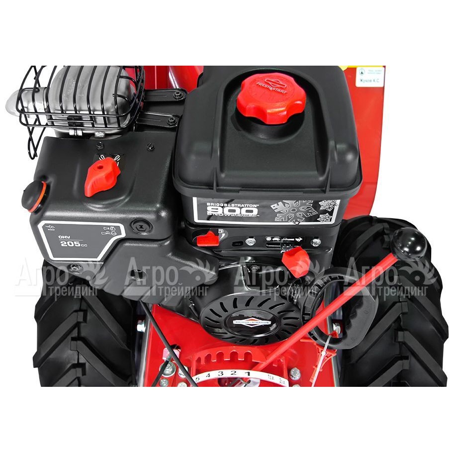 Модель оборудована высокими колесами, обеспечивающими ее высокую проходимость. Увеличенный шнек позволяет эффективно справляться даже с большими снежными сугробами. Снегоуборщик оборудован электростартером, облегчающим запуск. Для работы в условиях ограниченной видимости предусмотрена мощная галогенная фара. Снегоуборочная машина оснащена низкооборотным бензиновым двигателем – надежным и неприхотливым, не нуждающимся в частых сеансах технического обслуживания.